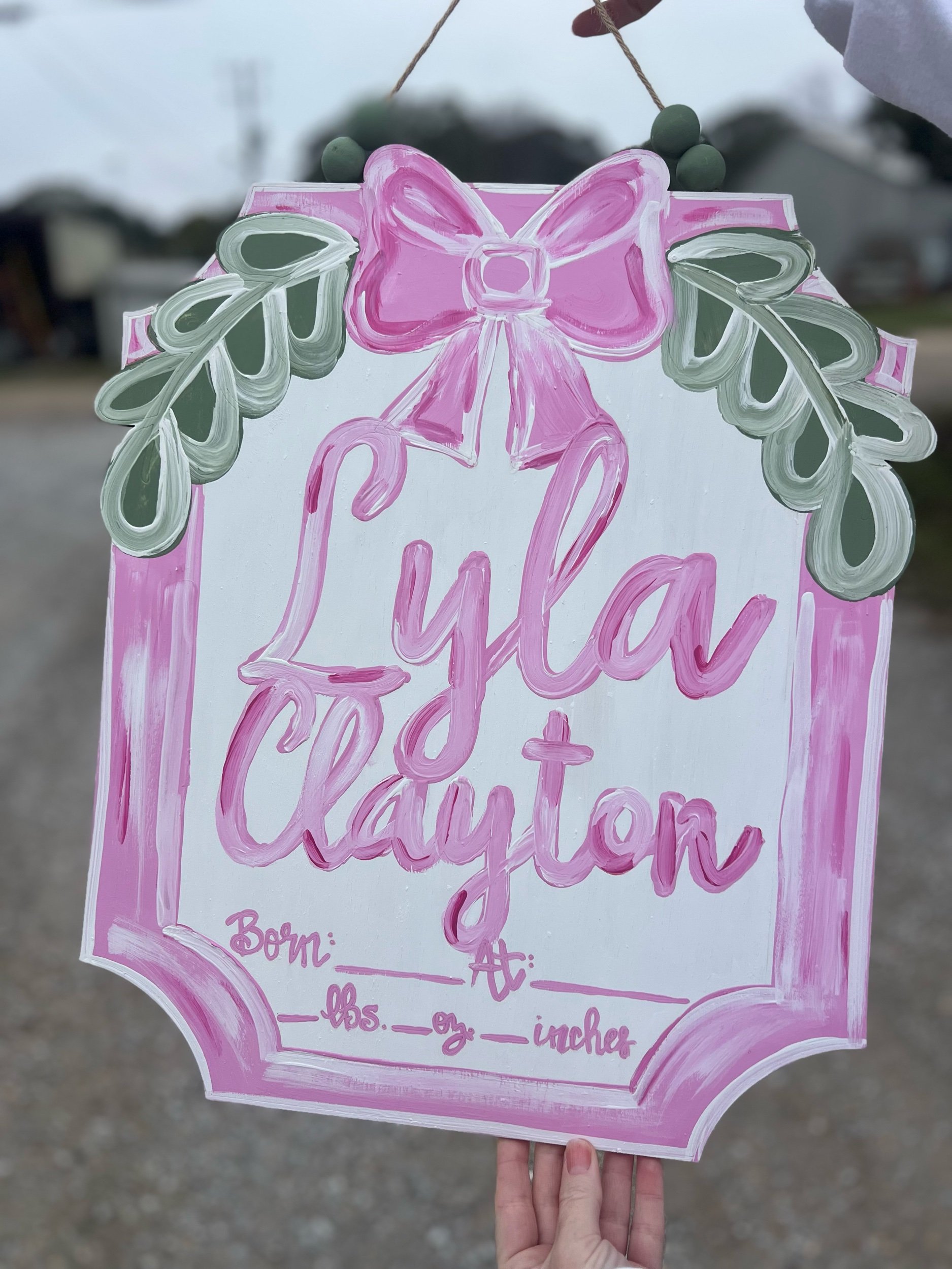 Custom Hand-Painted Birth Announcement Sign – 18” Wooden Door Hanger